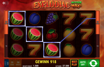 Explodiac ist ein spannender Früchte-Automat, bei dem insgesamt sieben verschiedene Gewinnsymbole über die fünf Walzen rotieren. Sechs verschiedene Früchte und die Sieben als Hauptgewinnsymbol kommen dabei sowohl einzeln als auch gestapelt vor und einen Gewinn erhalten Sie immer dann, wenn mindestens drei gleich Bilder auf einer der 10 Gewinnlinien von links nach rechts einlaufen. Als Einsatz können Sie dabei einen Betrag zwischen 10 Cent und 20 Euro wählen und Preise von bis zu 20.000 Euro pro Spiel gewinnen. Als Sondersymbol des Spielautomaten gibt es eine Bombe, die auf den ersten drei Walzen vorkommt und explodiert, sobald diese ins Gewinnbild einläuft. Durch die Explosion werden alle angrenzenden Symbole, maximal neun, zu Wilds und sorgen für tolle Gewinne. Nachdem Sie einen Preis erzielt haben, können Sie diesen auch beim Explodiac online Spielen bei einem der beiden Bally Wulff Risikospiele erneut aufs Spiel setzen.